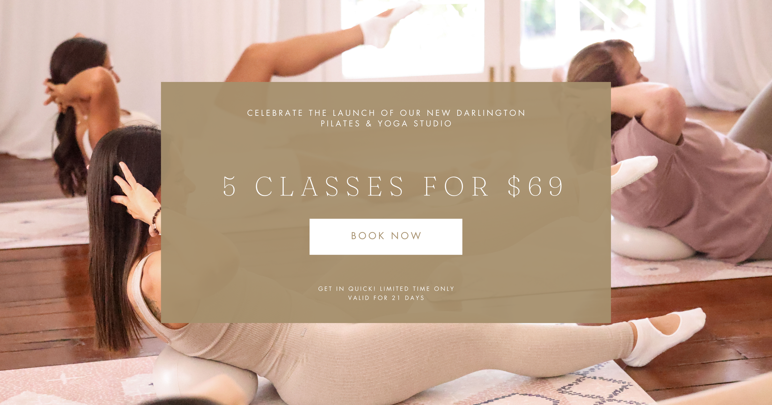 Celebrate the launch of our new Pilates and Yoga studio in Darlington with 5 classes for just $69! This limited-time offer gives you access to both our Darlington and Guildford locations. Enjoy floor-style Pilates and Yoga in Darlington or Reformer Pilates in Guildford, or both — your choice! Valid for 21 days from your first class and exclusive to new clients. Don’t miss out!